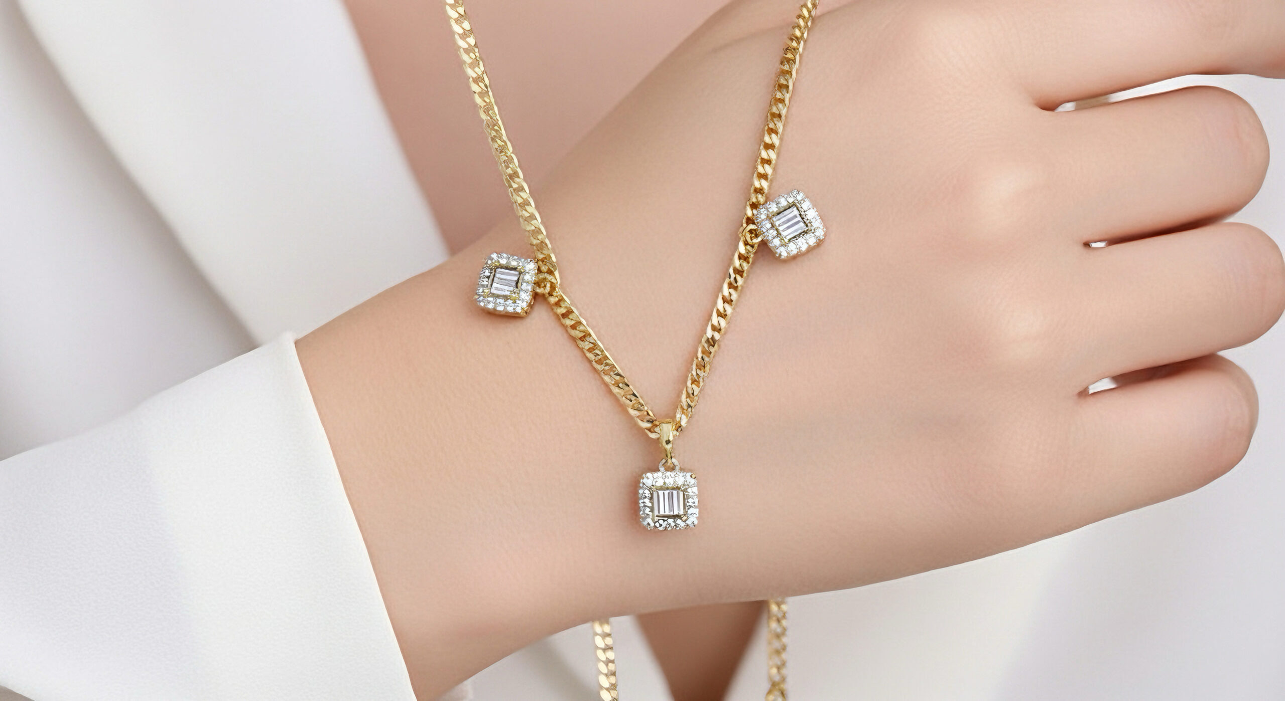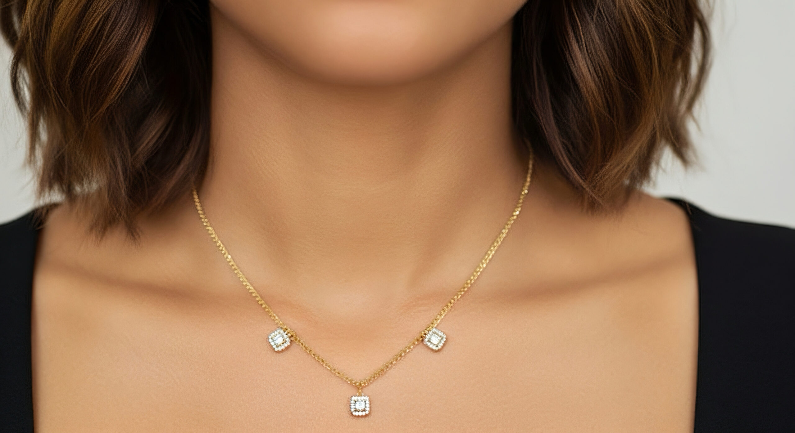 كولية ذهب عيار 18 قيراط يحتوي علي ثلاث دلايات تعطي شكل انيق يزيّن عنقك